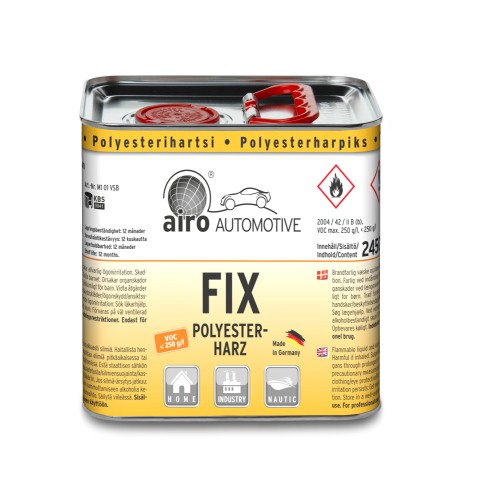 Polyesterhars met een hoge reactiviteit. In verbinding met glasmatten of glasweefsel voor de reparatie van auto carrosserieën of beschadigde plekken van GFK-onderdelen. Er kunnen ook kleine GFK-onderdelen van Airo FIX en glasmatten gemaakt worden. Goede hechting op staalplaat, glasvezelversterkte kunststof op polyesterbasis. Droge, goed slijpbare oppervlakte.