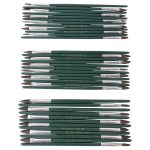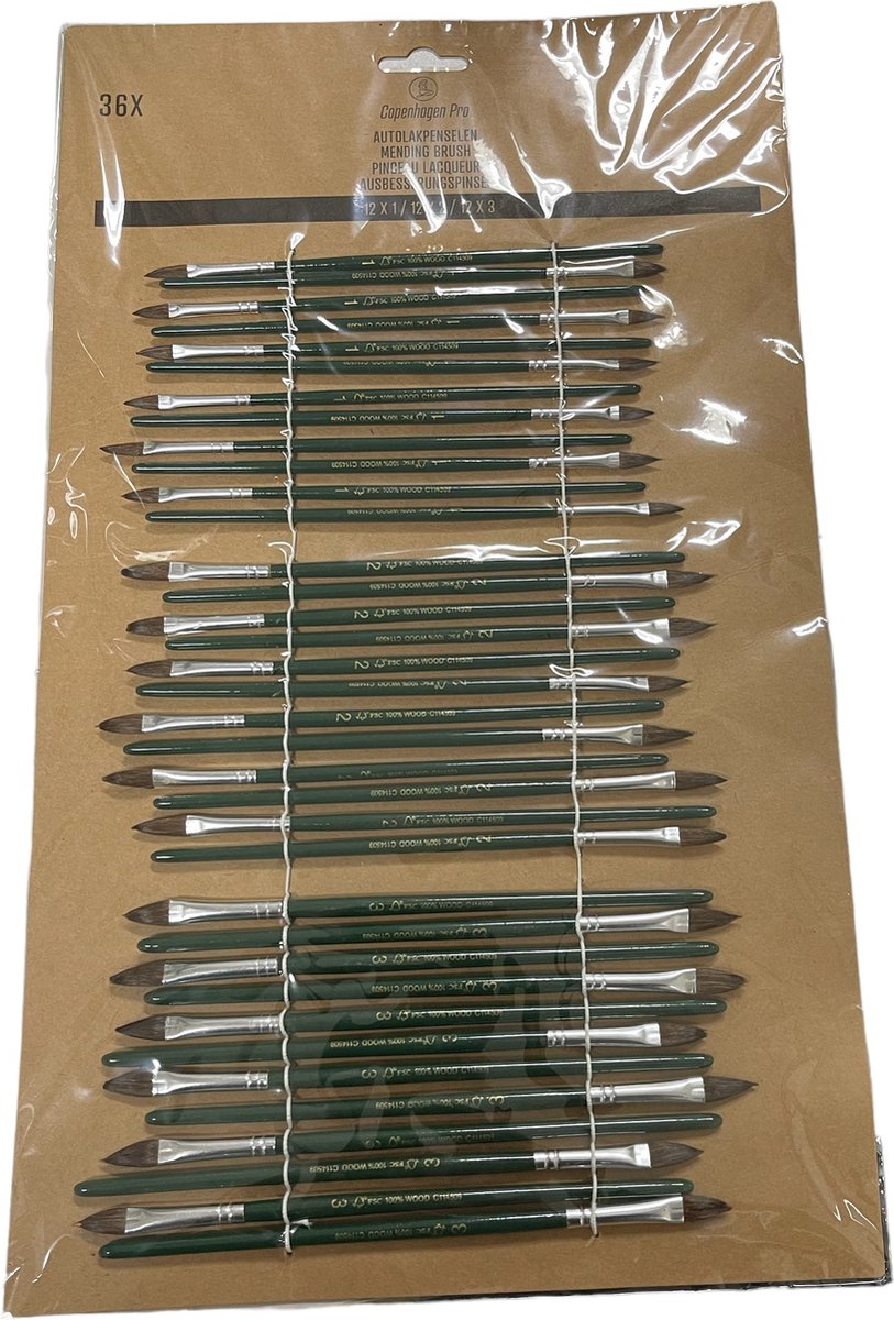 Autolakpenseel set 36 delig, met groen gelakte houten steel voorzien van een aluminium bus. In de maat 1-2 en 3. De haren zijn vervaardigd van wit Pony haar. Deze penselen zijn geschikt voor het bijwerken van lakbeschadigingen .