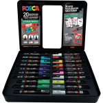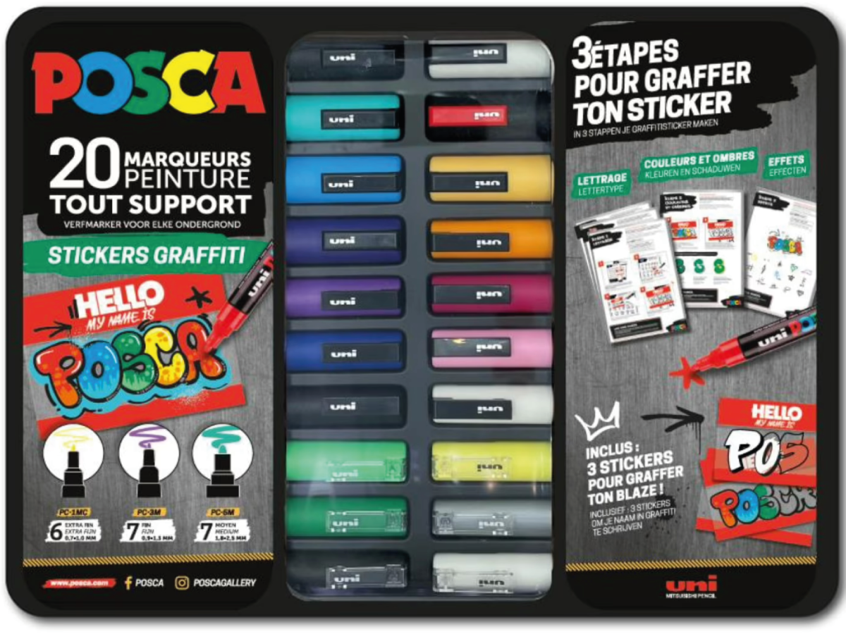 Posca koffer Graffiti Marker set. Met de Uni Posca Markerset creëer je levendige kunstwerken vol kleur en expressie! Deze markers staan bekend om hun veelzijdigheid en intense kleuren die zowel op papier, textiel, glas, hout en vele andere oppervlakken moeiteloos blijven zitten. Dankzij de unieke pigmentinkten droogt de inkt snel, vlekt niet en is permanent op poreuze ondergronden.