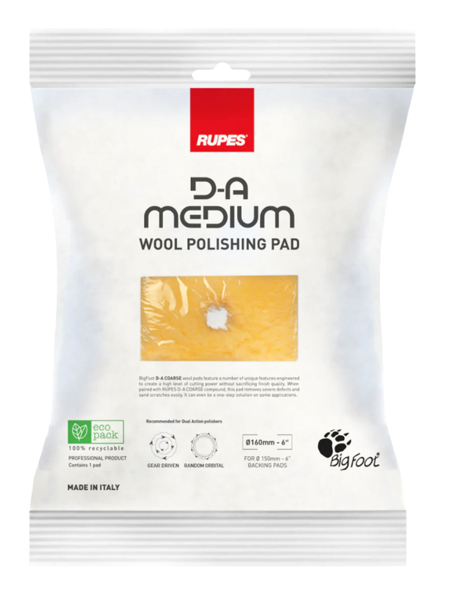 De Rupes DA Medium Wool Polishing Pad voor willekeurige orbitale, tandwielaangedreven en drievoudige actie zijn speciaal ontworpen voor het verwijderen van matige defecten. Het gele schuim van de medium wollen pad is veel flexibeler om een betere controle over rondingen en contouren mogelijk te maken, evenals een zachtere ondersteuning voor een beter afwerkvermogen. Het assortiment gele medium wollen pads heeft een consistente vezellengte van 15 mm door het hele oppervlak van de pads. Deze zachte en flexibele wol, gecombineerd met een zachte en flexibele gele schuimrug, garandeert niet alleen matige defecten, maar ook een uitstekende afwerking op de meeste oppervlakken. 9.BW100M Bigfoot