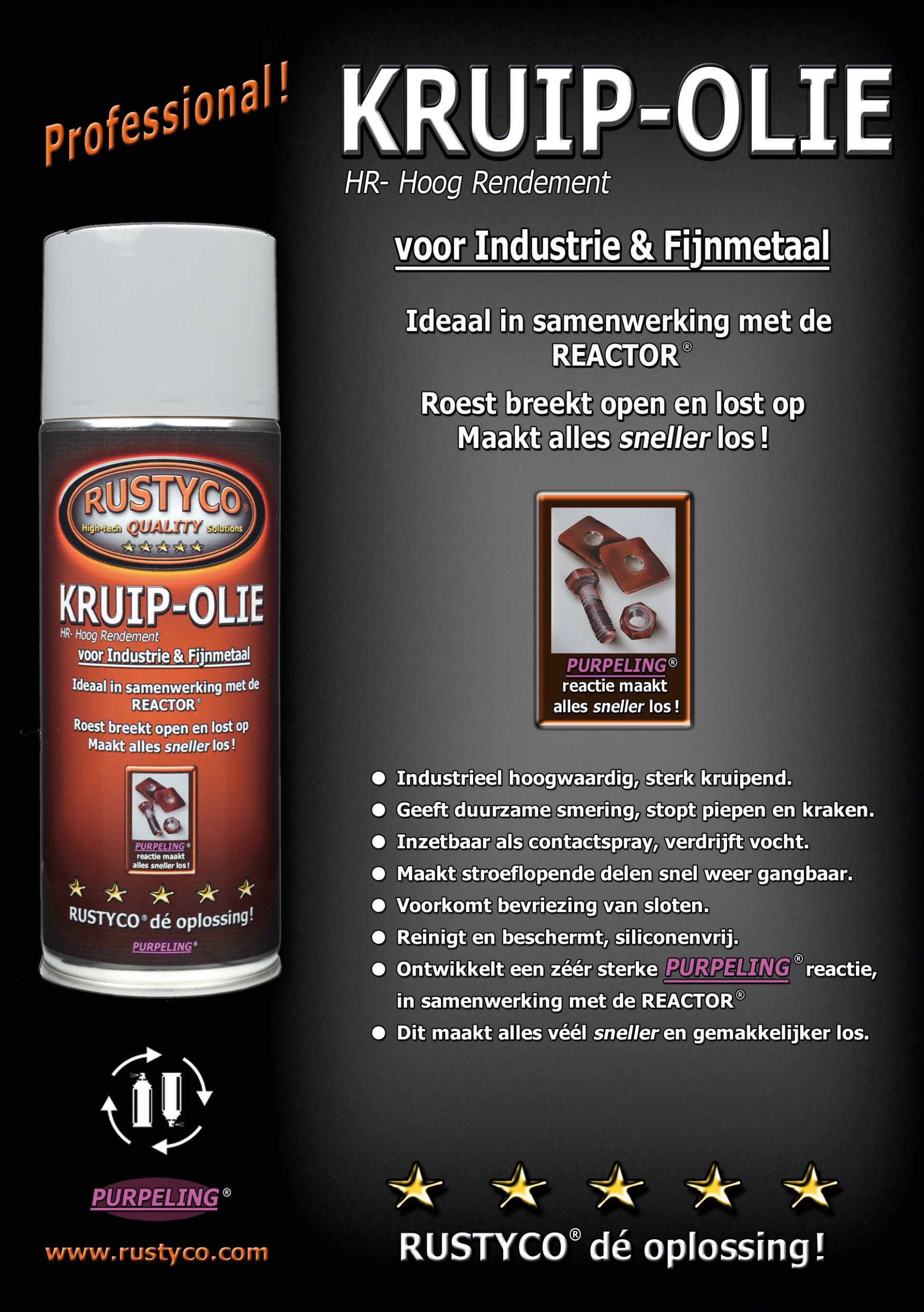 Ontwikkelt een zéér sterke PURPELING ® reactie, in combinatie met de REACTOR. Dit maakt alles véél sneller en gemakkelijker los. Kortom een zeer goede kruipolie. Voor meer informatie verwijzen wij u naar het Technisch informatieblad, te vinden onder het tabblad documenten.